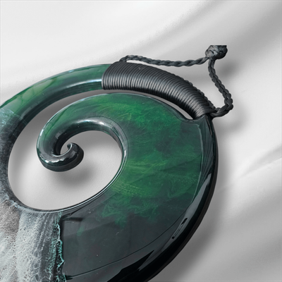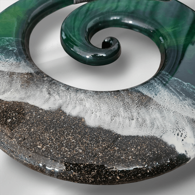 This large Koru wall hanging has been handcrafted crafted from resin, Sand from Hahei Beach, with a wood backing.