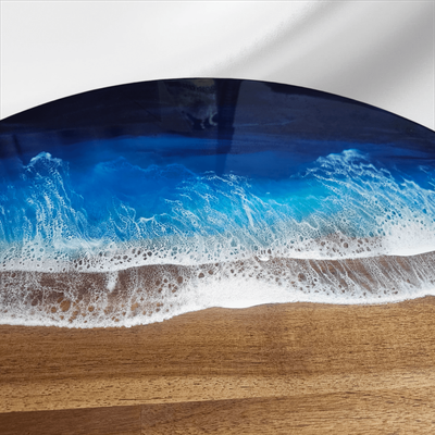 Crafted from a 600mmx18mm Acacia Wood Round on a lazy susan bearing cast aluminium base. Topped with a beautiful Blue Beached themed resin pour. Finished with a food grade natural finishing wax.