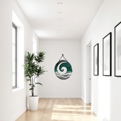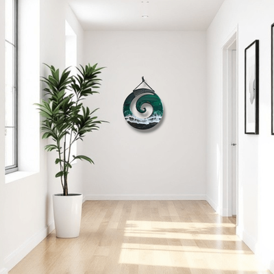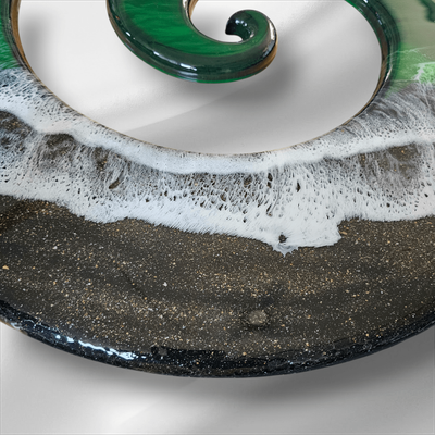 At a whopping 610mm diameter, this stunning beach-inspired koru has been crafted with gorgeous green tones of resin and Hahei Beach sand encased in the bottom. It is a statement piece for any wall, promoting flow and serenityc
